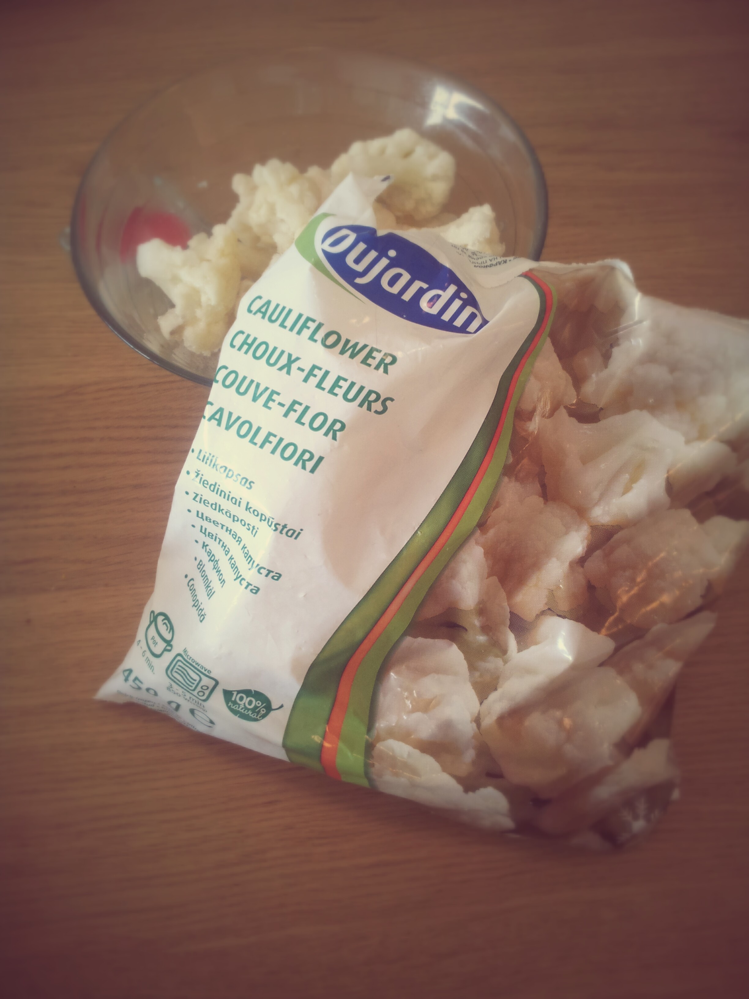 - 1 poki frosið blómkál – Ef þið notið ferskt, þá er nóg að rífa niður hálfan haus.