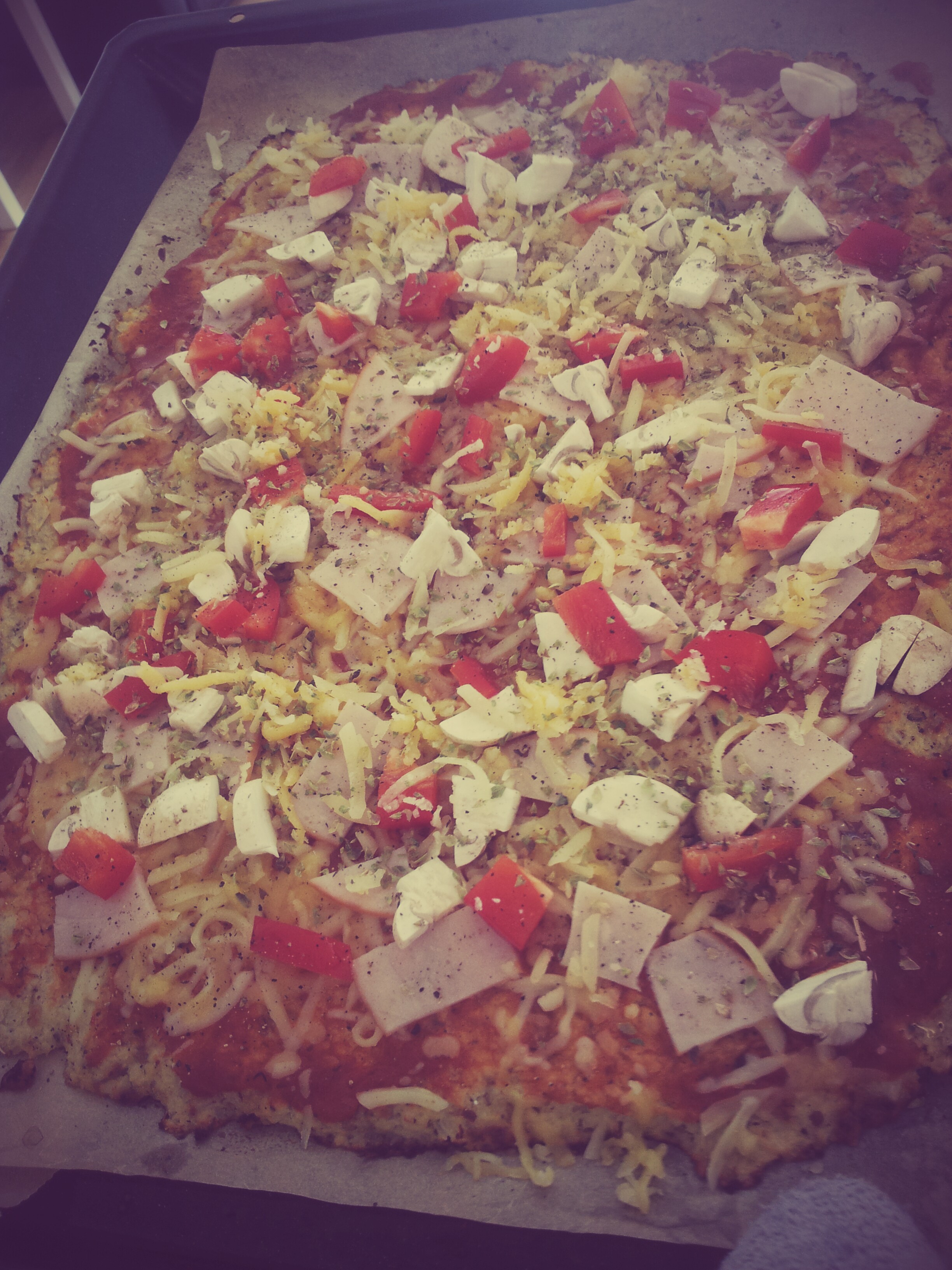 Ég byrja á því að afþýða blómkálið í örbylgjuofninum og skelli því svo í matvinnsluvélina. Ég á svo lítin og krúttlegan töfrasprota þannig ég þurfti að hakka blómkálið í þrem hollum og setti síðan í stóra skál. Í hana bætti ég svo öllu gumsinu og hrærði með sleif. Þegar það var komið þá setti ég bökunarpappír á plötu og flatti út botninn með höndunum, skellti botninum inn í ofn á blástur og 200°í ca. 15min. Tók hann síðan út og setti það sem mig langaði í á pítsuna, ég set alltaf ostin undir svo að áleggið soðni ekki og síðan setti ég kjúklingaskinku, sveppi, papriku, svartan pipar, oregano og smá hvítlauksolíu og aftur inn í ofn þar til osturinn er bráðnaður. Síðan er hún bara tilbúin, mæli með að þið notið ostaskera eða spaða til þess að ná henni af plötunni, botninn er linur.