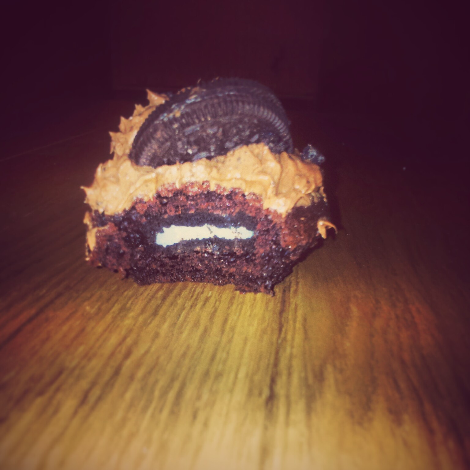 Blöndum öllum þurrefnunum saman fyrst og síðan setjum við smjörlíki, ab mjólk og eggin út í. Hrærum þetta vel saman. Síðan setti ég muffins form ofan í bökunarform sem er fyrir muffins og setti botnfyllir af deiginu með tsk. Svo setti ég Oreo kexköku ofan á það og þrýsti því ofan í, aftur smá deig yfir kexið. Síðan setti ég caramel súkkulaðibita ofan á það og síðan smá deig yfir o.s.fr. S.s. fyrst smá deig, síðan Oreo kex, smá deig, caramel og smá deig. Þarf ekki endilega að setja deig ofan á karamelluna, skiptir bara mestu máli að oreo kexið sé þakið deigi.