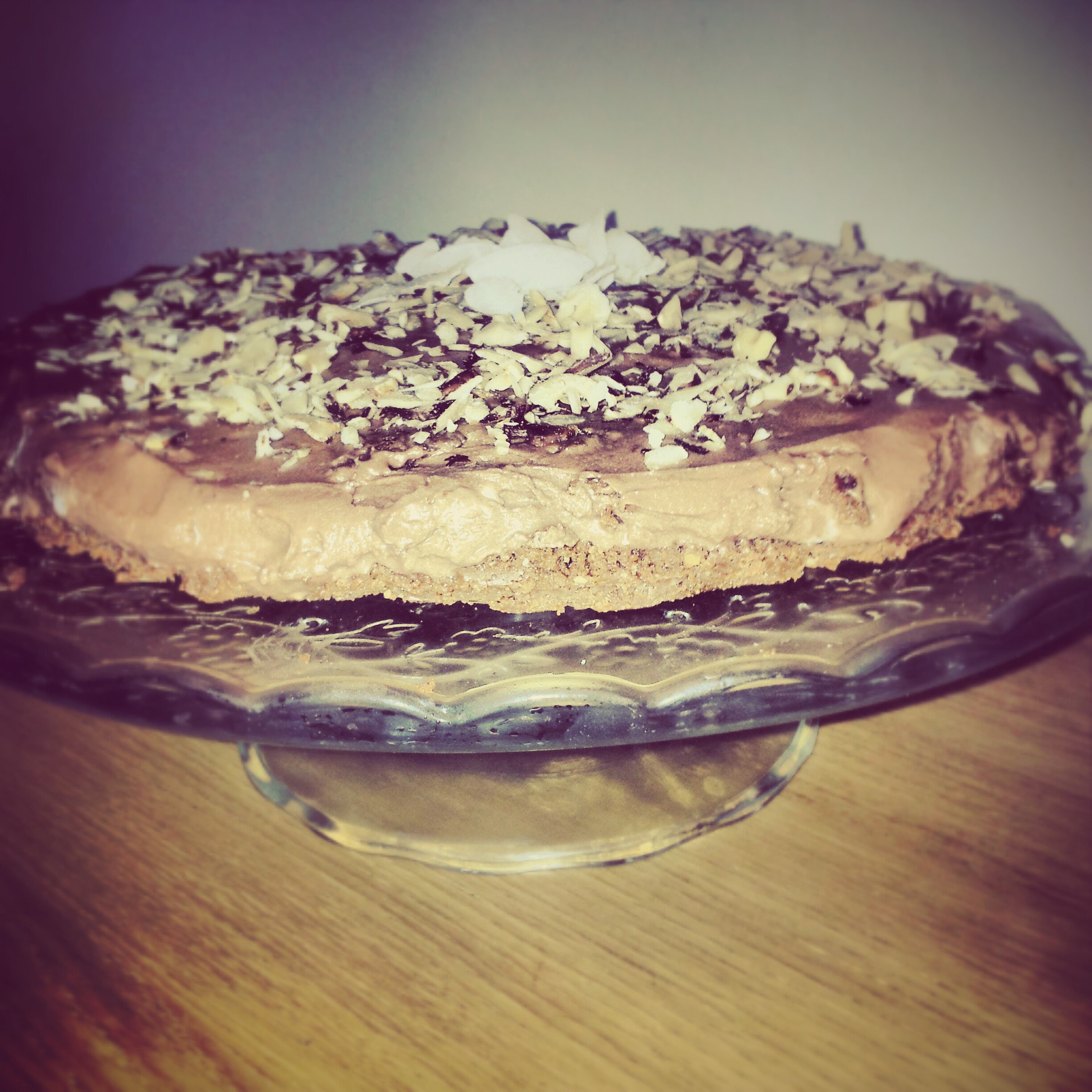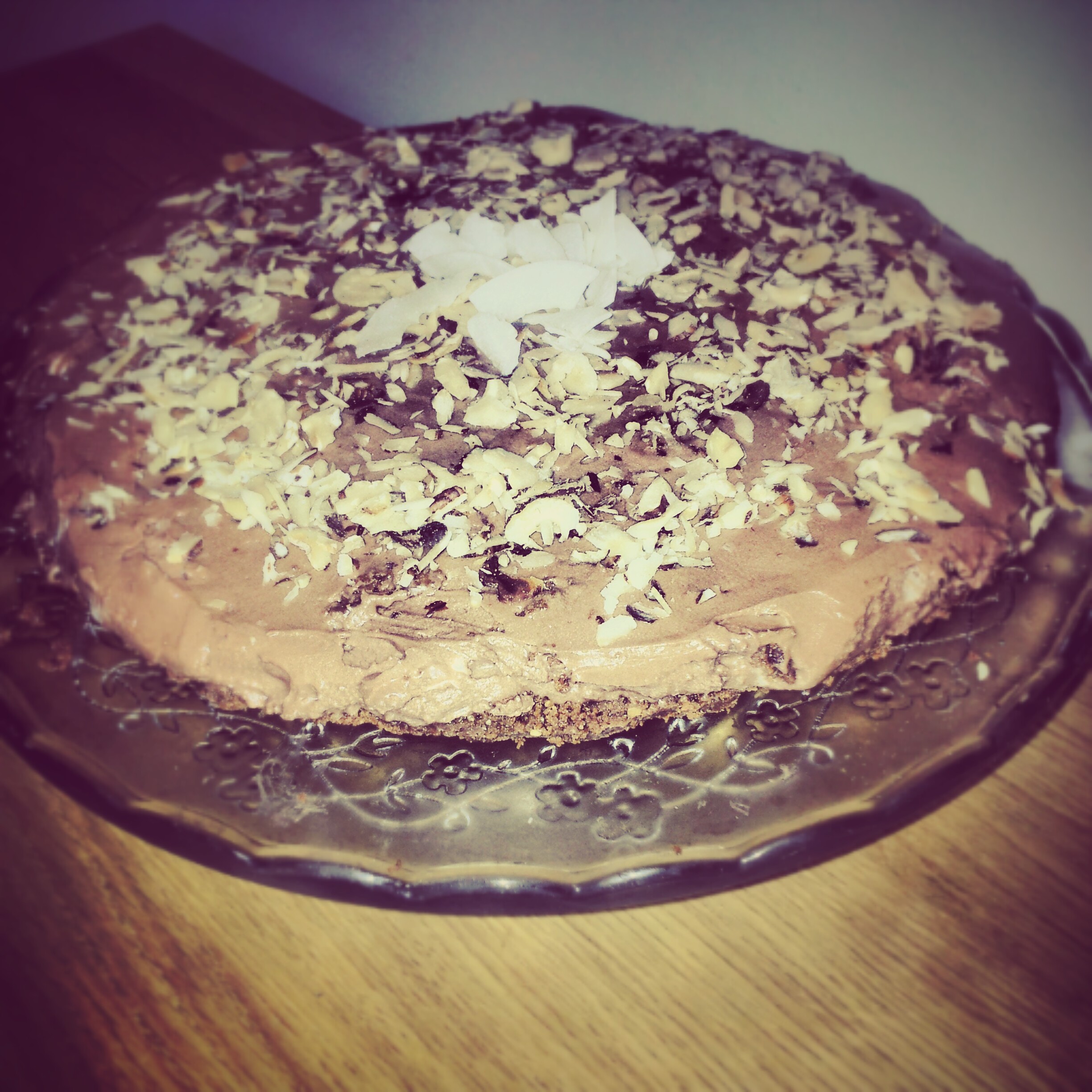 Byrjið á því að hræra rjómaostinn og flórsykurinn vel saman. Síðan er nutellanu bætt út í og hrært vel. Ég ákvað að setja kókosbollur út í líka, sjá hvernig það kæmi út, það var btw hrikalega gott. Hrærið þeim vel saman við allt saman. Takið síðan botnin út úr ísskápnum og hellið þessu yfir og dreifið vel. Þetta á að vera inn í ísskáp í svona 4klst eða yfir nótt, en ég flýtti aðeins fyrir með því að henda þessu í frystinn í smá tíma. Tók þetta út eftir ca. 1 1/2klst og setti kökuna þá á disk og skreytti með hesilhnetuflögum og kókosflögum.