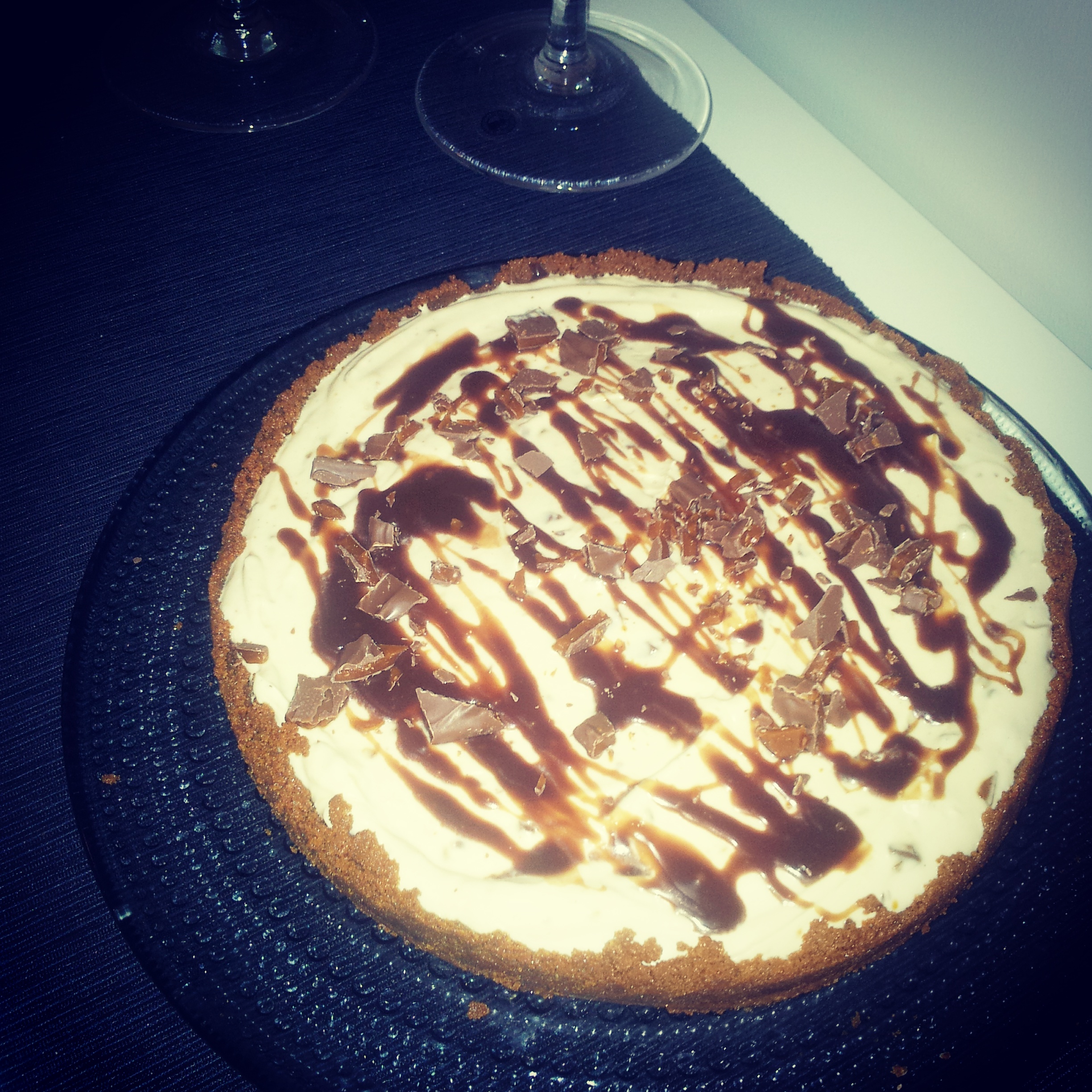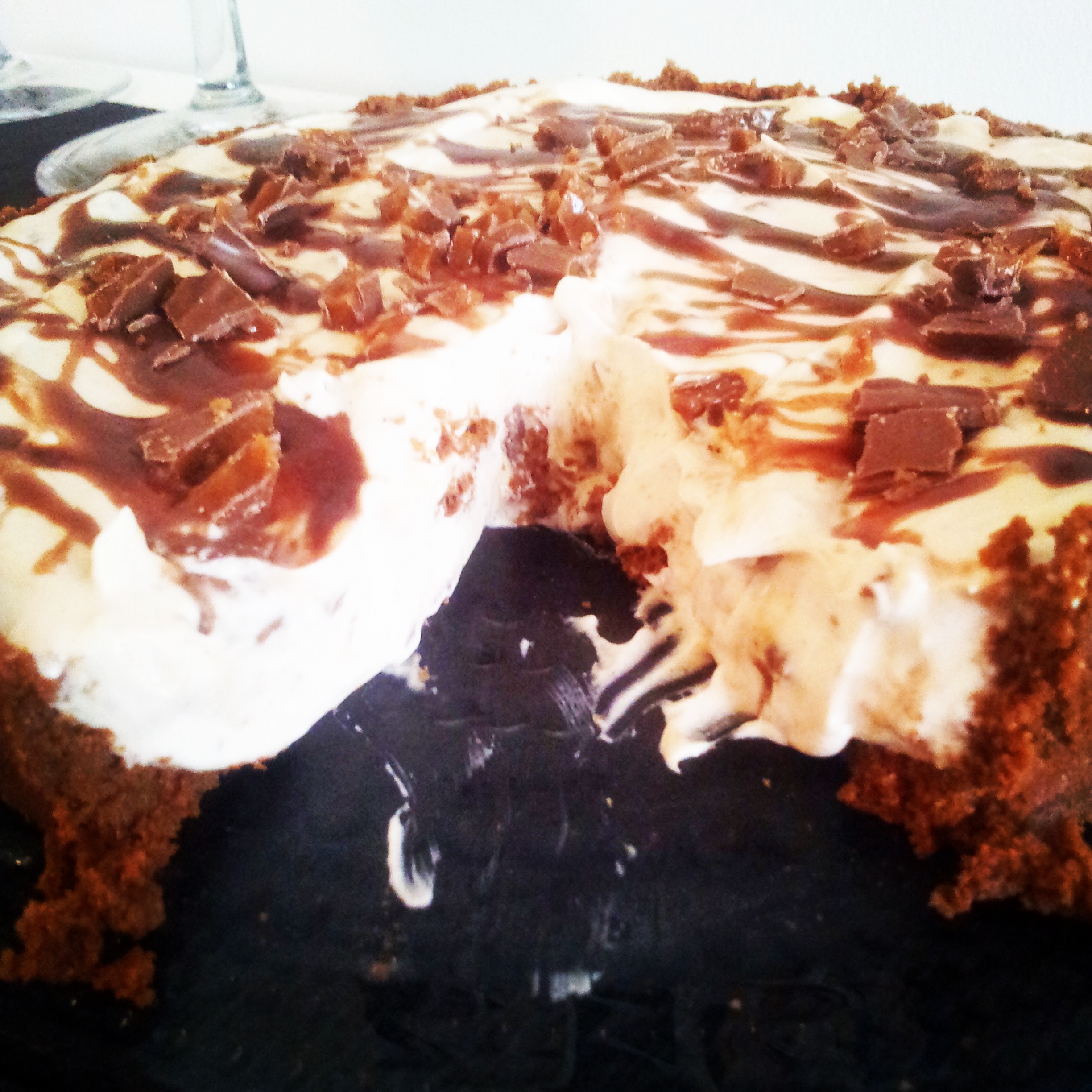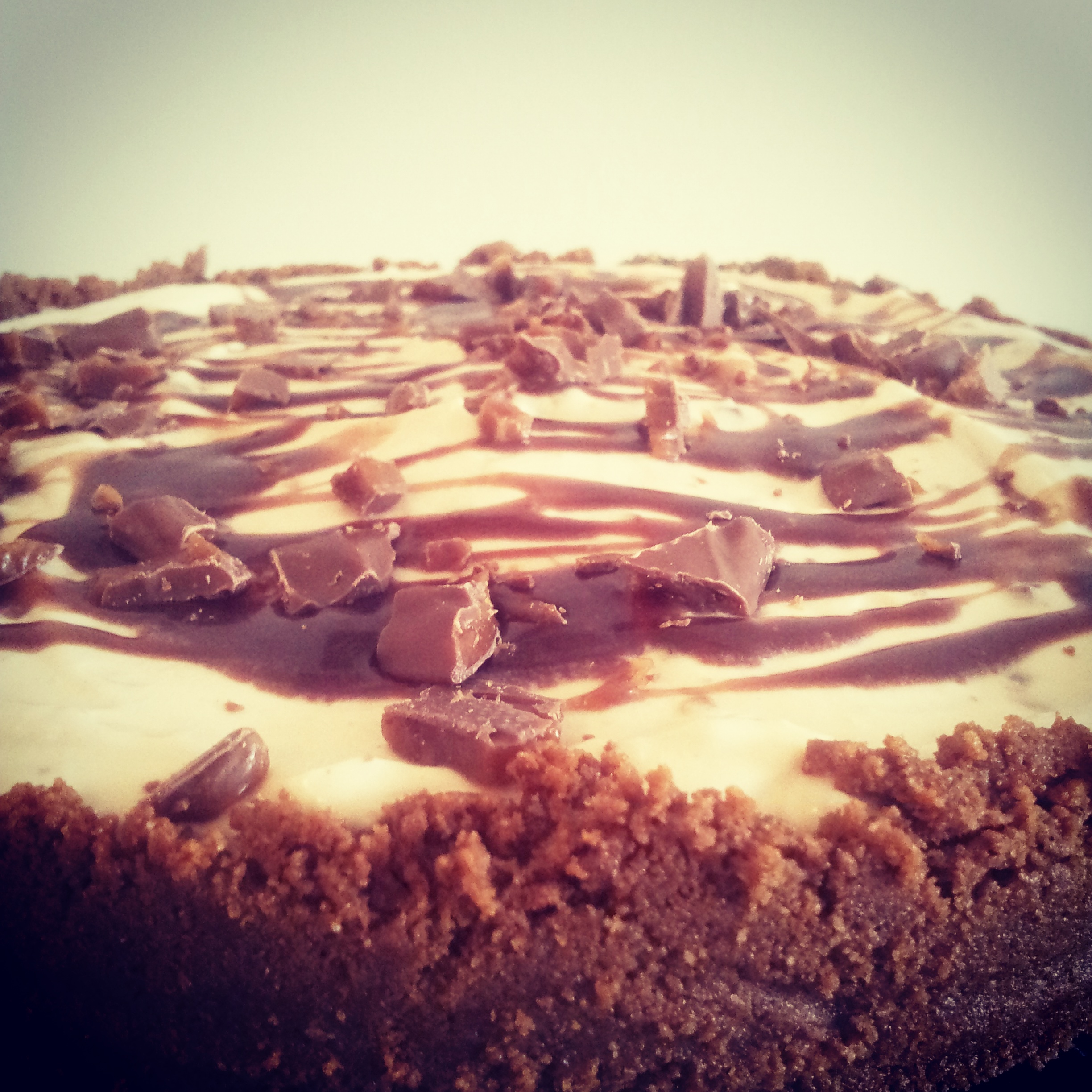 Byrjið á því að þeyta rjóman og bætið síðan vanillskyrinu saman við. Á meðan rjóminn var að þeytast þá bræddi ég hvíta súkkulaðið í potti við vægan hita og lét það kólna smá áður en ég bætti því við í fyllinguna. Einnig bræddi ég karamellupipp með smá rjómagusu út í við vægan hita til þess að skreyta kökuna með og ákvað að setja pínu af því út í fyllinguna til að fá smá lit. Síðast setti ég vanillusykurinn og daimið, blanda því vel saman. Hellið fyllingunni ofan í botninn og kælið í ísskápnum í smá tíma áður en skreytt er. Í skreytinguna fór 60 gr karamellupipp + smá rjómi og 2 tsk af sýrópi & smá niðurskorið Daim.